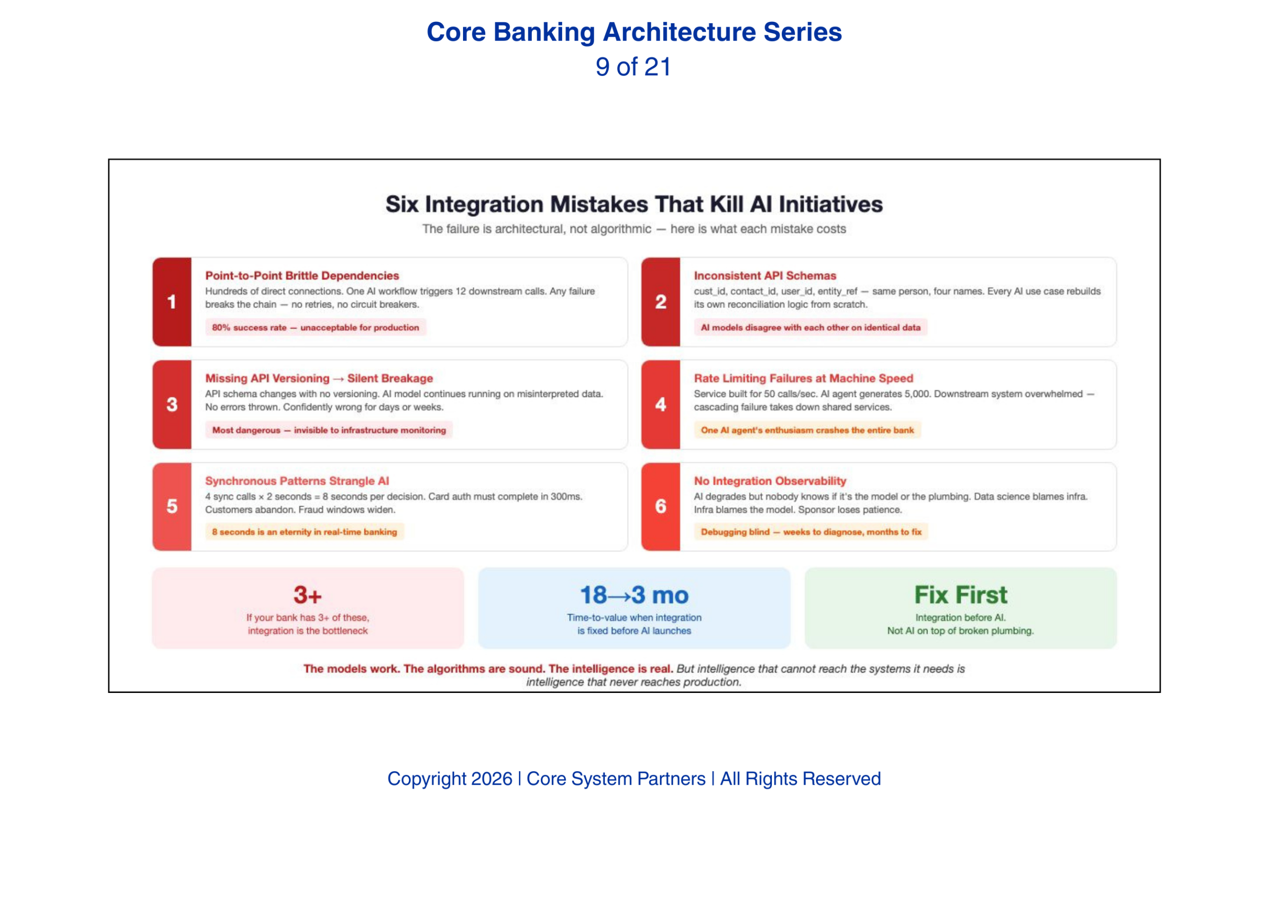 With the infrastructure foundations established — architecture, data, APIs, events, and integration discipline — the series now turns to the governance and control layer. This is where the stakes shift from operational efficiency to institutional risk. The next article addresses the hardest truth about AI governance: it is an architectural problem, not a compliance form. Banks that try to govern AI through documentation alone will discover that governance without infrastructure is theater — and examiners are beginning to notice the difference.