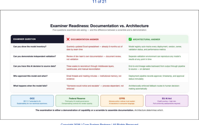 The difference in the examination room is stark. A bank with architectural governance pulls up a dashboard, walks the examiner through the decision trail, and shows the infrastructure controls in real time. A bank with documentation governance asks for two weeks to compile the information — and the examiner writes that down.