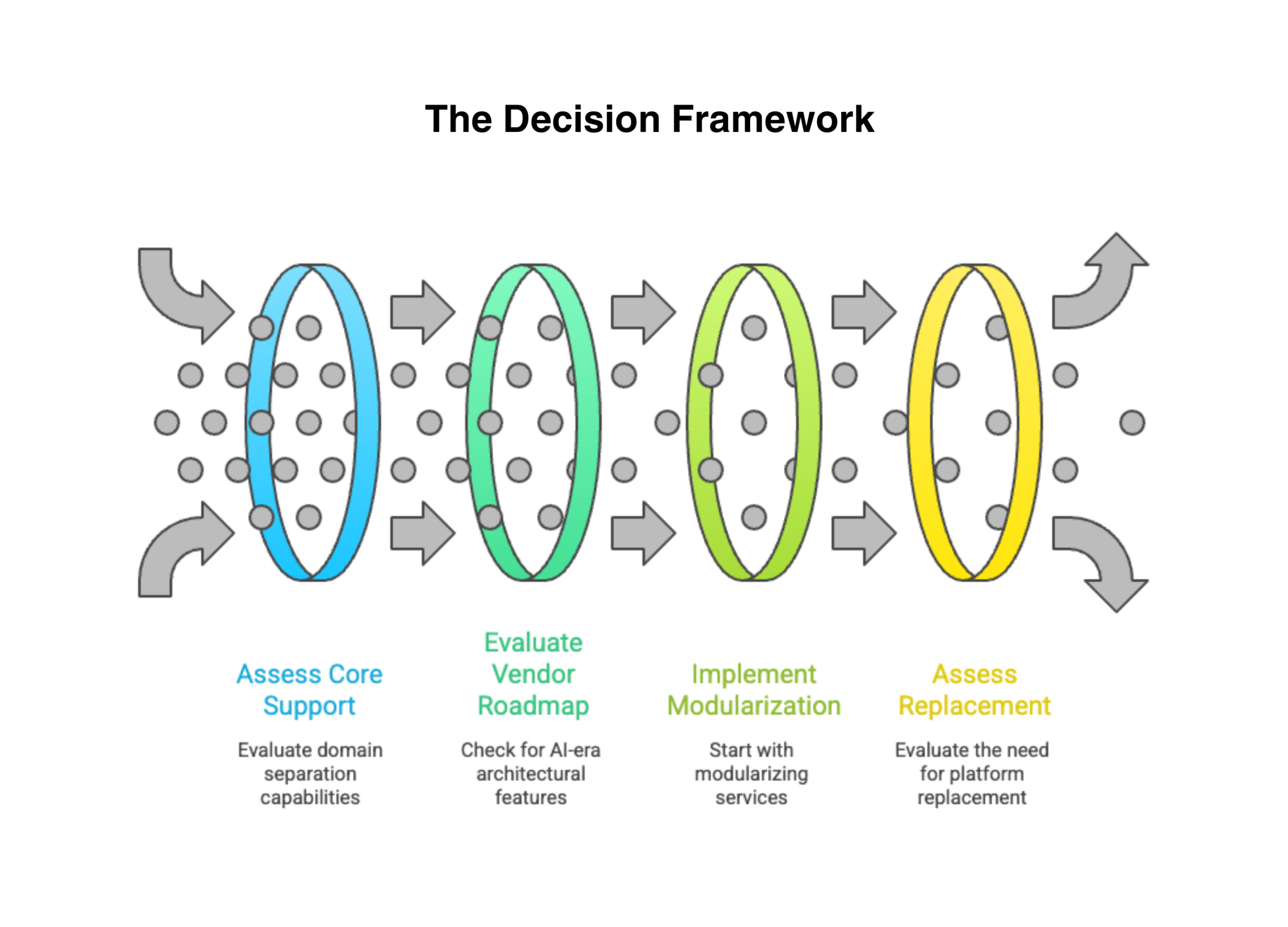 When both answers are yes, modularize. When both answers are no, replace. When the answers are mixed, the sequencing matters: modularize what you can to reduce dependency on the core, then evaluate replacement once the blast radius is manageable.