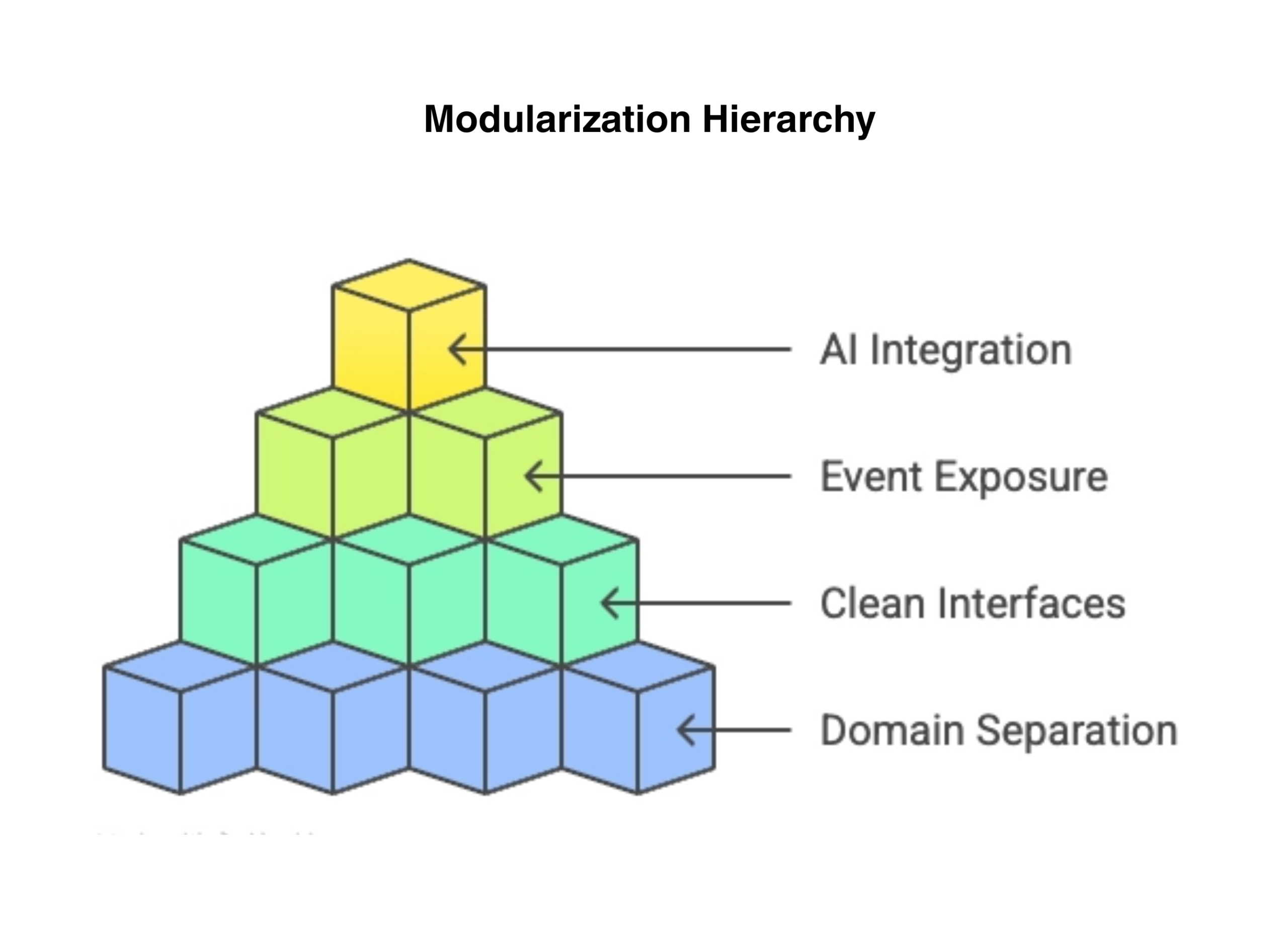 AI-ready architecture is built step-by-step: domain separation, clean interfaces, event exposure, then AI integration.