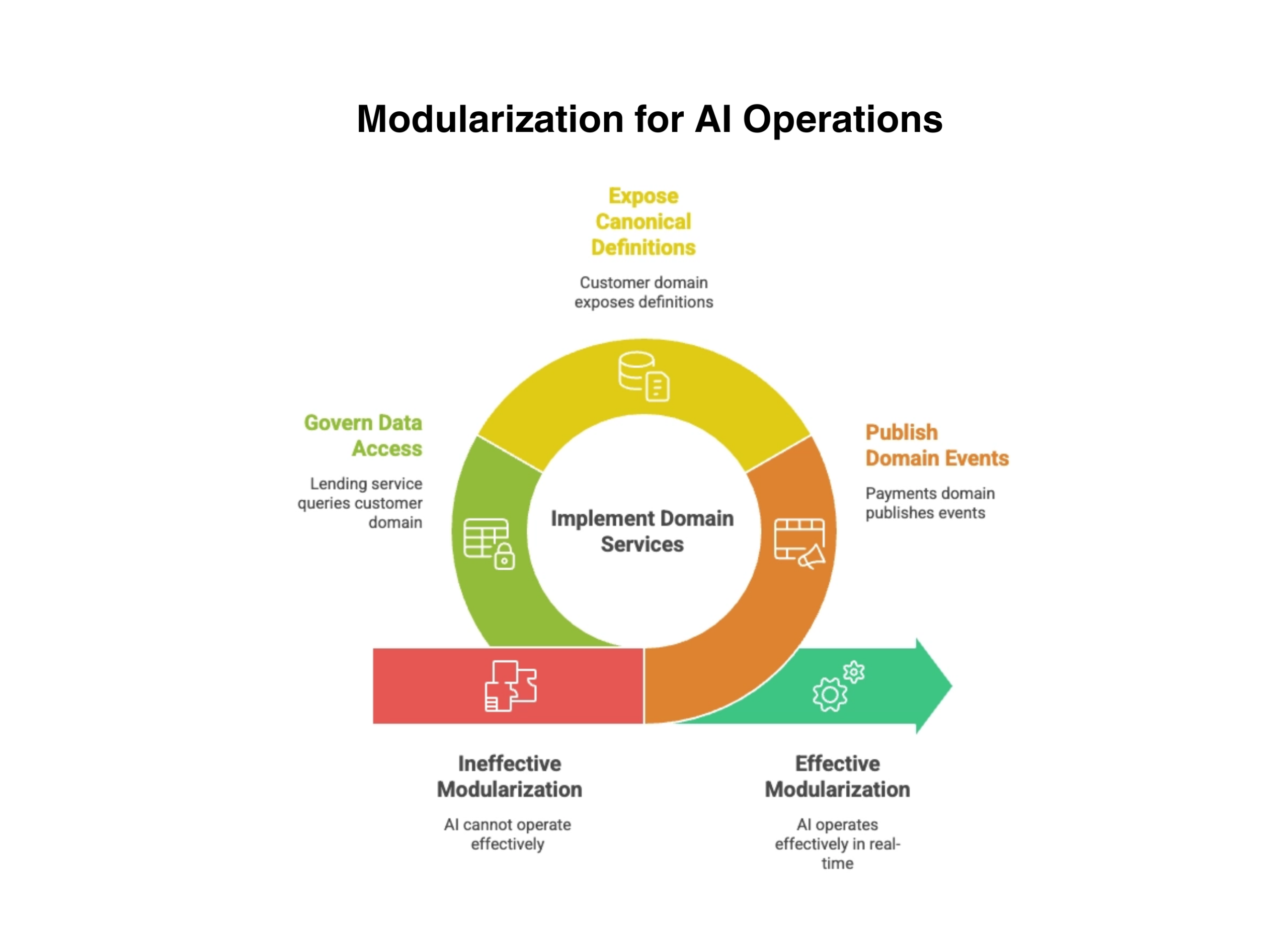 AI operates effectively when modular domain services expose canonical definitions, governed data access, and real-time events.