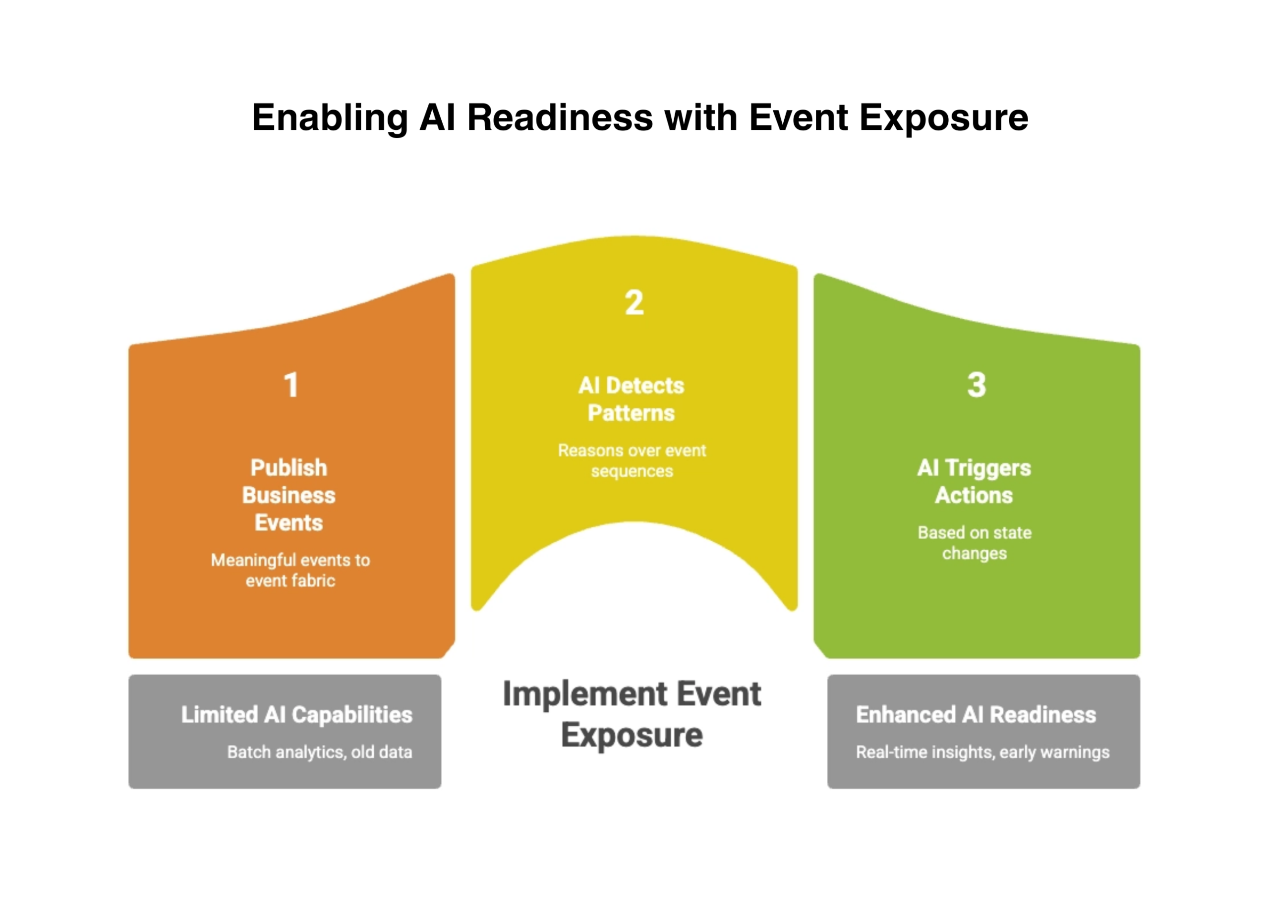 The single most important capability that modularization must deliver for AI readiness is event exposure. AI systems reason over events. They detect patterns in sequences. They trigger actions based on state changes. Without events, AI is limited to batch analytics — looking at yesterday’s data to make today’s decisions.